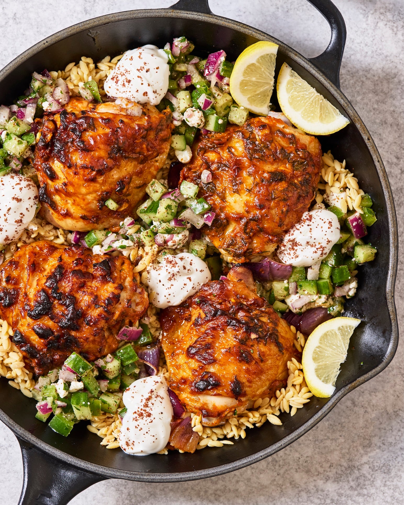 - Mediterranean Chicken & Rice Skillet: One-pan, high-protein comfort food with bright, fresh flavor.